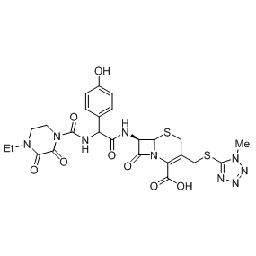 化學(xué)名: (6R,7R)-3-[[(1-甲基-1H-四唑-5-基)硫]甲基]-7-[(R)-2-(4-乙基-2,3-二氧代-1- 哌嗪碳酰氨基)-2-對(duì)羥基苯基-乙酰氨基]-8-氧代-5-硫雜-1-氮雜雙環(huán)[4.2.0]辛-2-烯-2-甲酸